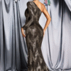 Vestido largo de un hombro con textura brillante y abertura lateral que estiliza la figura. Perfecto para eventos de noche.