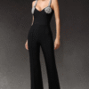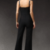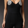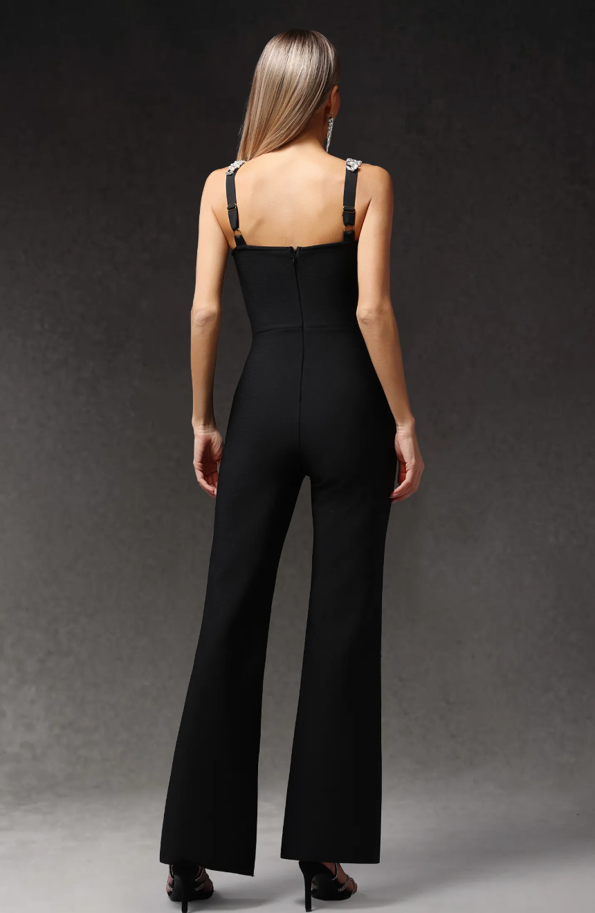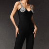 Mono largo de corte recto y tela elastizada con detalles en los hombros que aportan sofisticación. Una opción moderna y elegante para eventos formales.