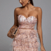 Vestido corto de silueta ajustada con escote strapless tipo corset que realza el busto y define la figura. Confeccionado en tela con lentejuelas en tonos rosados que aportan brillo y efecto visual, se destaca por su falda con aplicación de plumas que suman movimiento y un aire glam. Un diseño femenino, divertido y de alto impacto, ideal para fiestas, cumpleaños o eventos donde buscás un look protagonista.